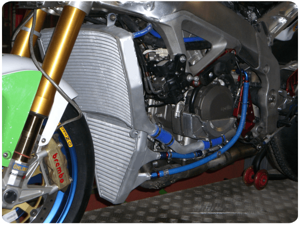 Grand WSBK Aprilia RSV4 (2009…) Radiateur de course d’huile / d’eau pour un refroidissement optimal de votre bloc moteur. La partie supérieure de ce radiateur est refroidie à l’eau et la partie inférieure l’est à l’huile (ne pas remplir d’eau !). Ce radiateur fournit une puissance supplémentaire lorsque les blocs moteurs sont relevés. En effet : les blocs avec une puissance supplémentaire ont également besoin d’un refroidissement supplémentaire. Sinon, la puissance ne sort pas.